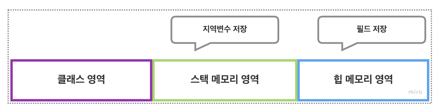 따라서 우리가 'new' 키워드와 생성자를 통해 클래스의 객체를 생성한다는 것은 해당 객체를 힙 메모리에 넣고 그 주소값을 참조변수에 저장하는 것 이다.