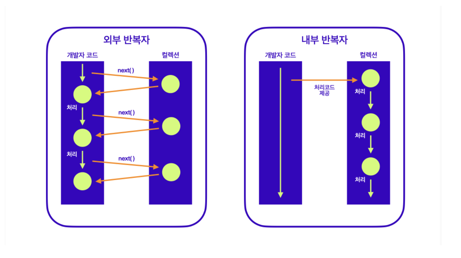 외부반복자(external iterator)란 개발자가 코드로 직접 컬렉션의 요소를 반복해서 가져오는 코드 패턴을 말합니다. index를 사용하는 for문, Iterator를 이용하는 while문은 모두 외부 반복자를 이용하는 형태이다.