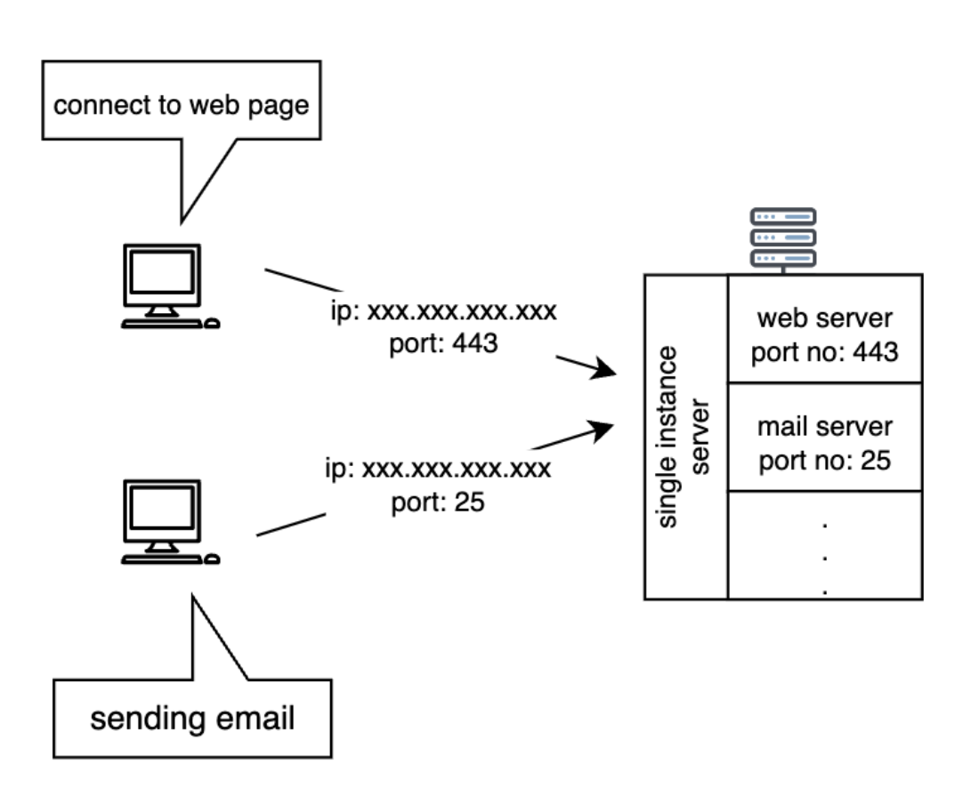 위 그림과 같이 한 서버 인스턴스에서 웹서버와 메일서버 두개를 동시에 실행 중이라고 가정하면, IP주소만으로는 어느 서버로 요청을 보내는지 알 수 없다. 이러한 경우를 위해, 포트 번호를 사용해 receiver를 특정해 어느 서버로 보내는 요청인지 특정할 수 있다.
