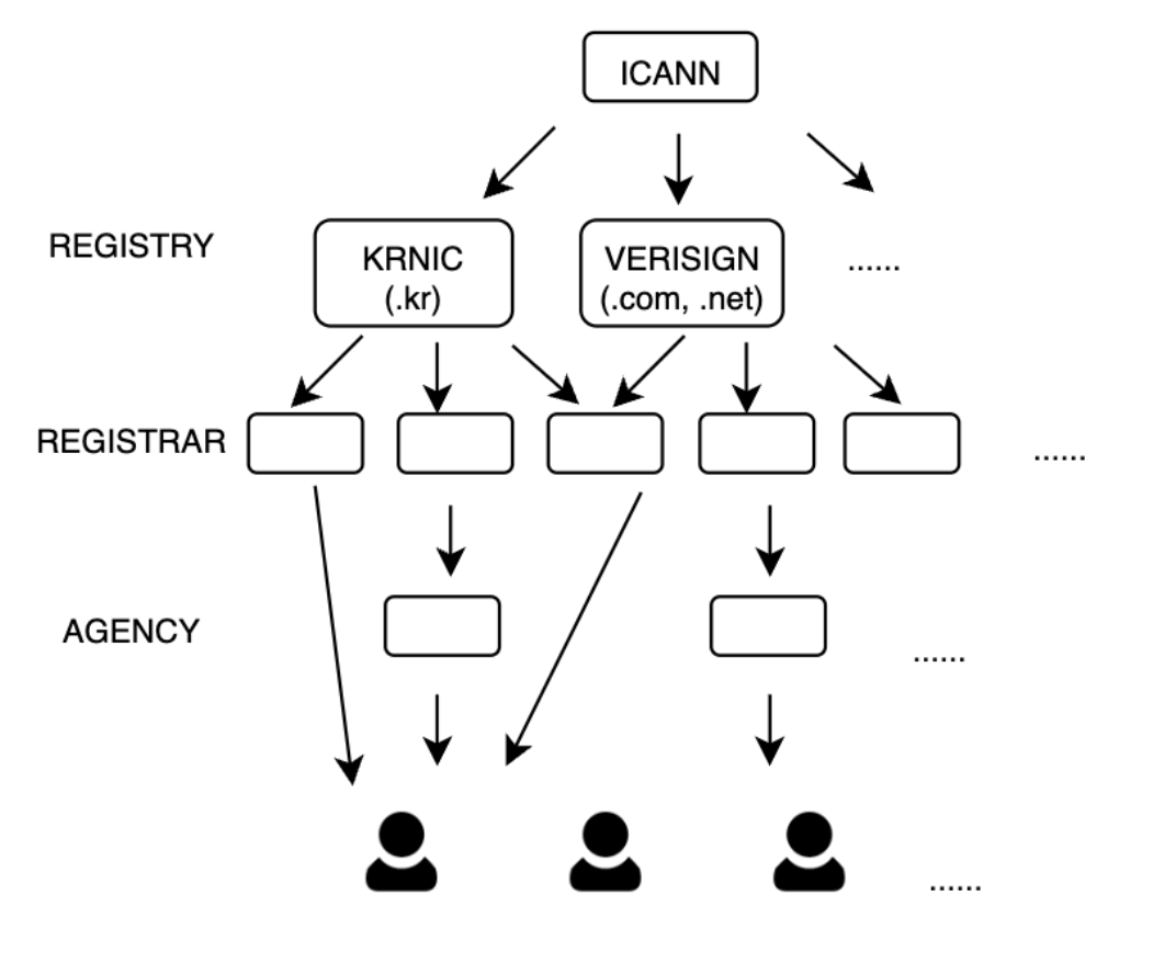 도메인은 ICANN이라는 비영리 단체가 관리하고 있다. 그 밖의 조직으로 registry 와 registrar 가 있다.